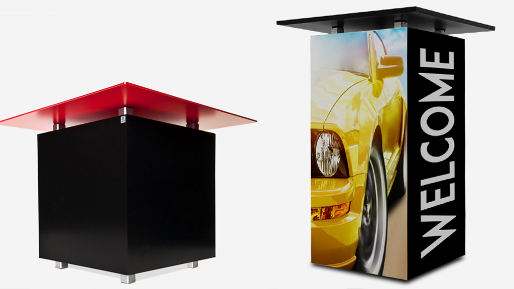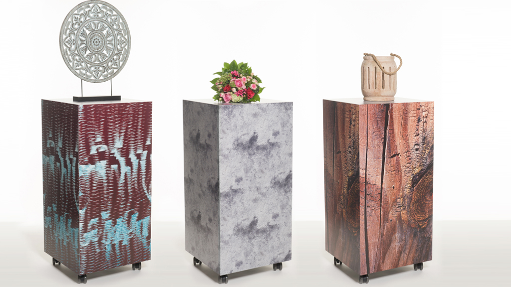Größte Mobilität für den Stehtisch lässt sich mit der einfachen Anbringung von Rollen erreichen. Das ist praktisch für Arbeiten im Stehen, spontane Kundengespräche oder Snackbereitstellungen. Für Produktpräsentationen ist die Verwendung als Podest, Präsentationssäule und Galeriesockel möglich. Einfach Tischplatte abnehmen und bei Bedarf Verkleidung austauschen!
